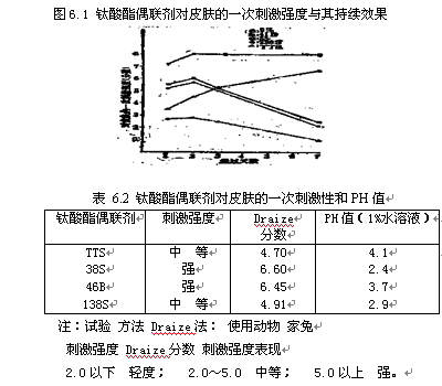 鈦酸酯偶聯劑對皮膚的刺激性較強,操作時應注意(表6.2),這是各種鈦酸酯的水溶液的PH值均屬酸性(PH = 2.4~4.1)之故。 TTS、55、238S對皮膚的刺激作用會逐漸減弱下來,但有些品種則呈現相反的傾向(圖6.1)。