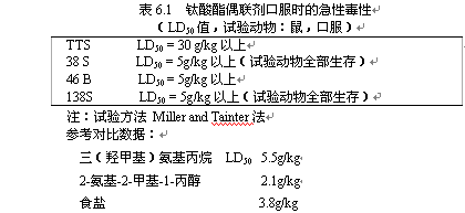 如表6.1所示,鈦酸酯偶聯劑的LD50值均在5克/公斤以上,與我們日常生活中食用的食鹽的LD50值為3.8克/公斤相比,可以說鈦酸酯偶聯劑的急性毒性是相當低的。