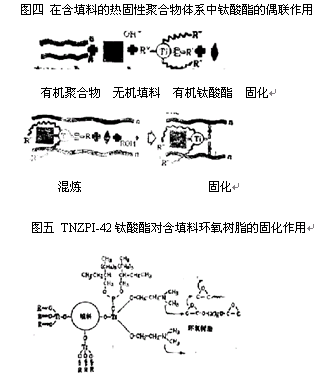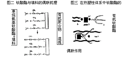 因為依然具有鈦酸酯的化學(xué)結(jié)構(gòu),所以在過剩的偶聯(lián)劑存在下,使表面能變化,粘度大幅度降低。在基體樹脂相由于偶聯(lián)劑的三官能基和酯基轉(zhuǎn)移反應(yīng),可使鈦酸酯分子偶聯(lián)。這就便于鈦酸酯分子的變型和填充聚合物體系的選用。見圖二、三、四、五。